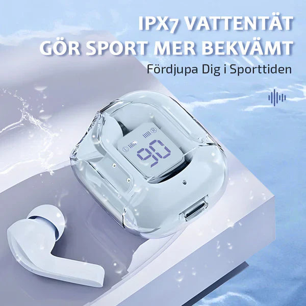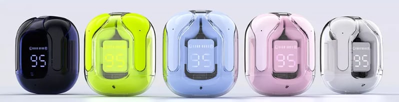 - [Digital LED display and colorful design] Accurate LED display of the power of the charging case and both earbuds, so you can know the power status of the wireless earbuds and charging case at any time. This series of Bluetooth earphones with transparent charging case, futuristic structure, 5 different colors. The waterproof earbuds can effectively prevent splash damage caused by sweat and raindrops.