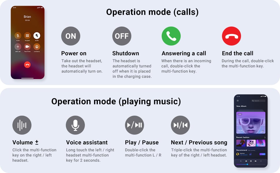 - [Smart Touch Control and Comfortable Fits] ACEFAST wireless earbuds for iphone support touch control of each individual earbud, you can easily control answer or hang up calls, play or pause, volume up or down, change songs etc without using the phone. T6 Bluetooth earbuds with 3 different sizes of earbuds for most ear canals. The attached silicone case fits perfectly with the wireless earbuds, giving you a comfortable experience.